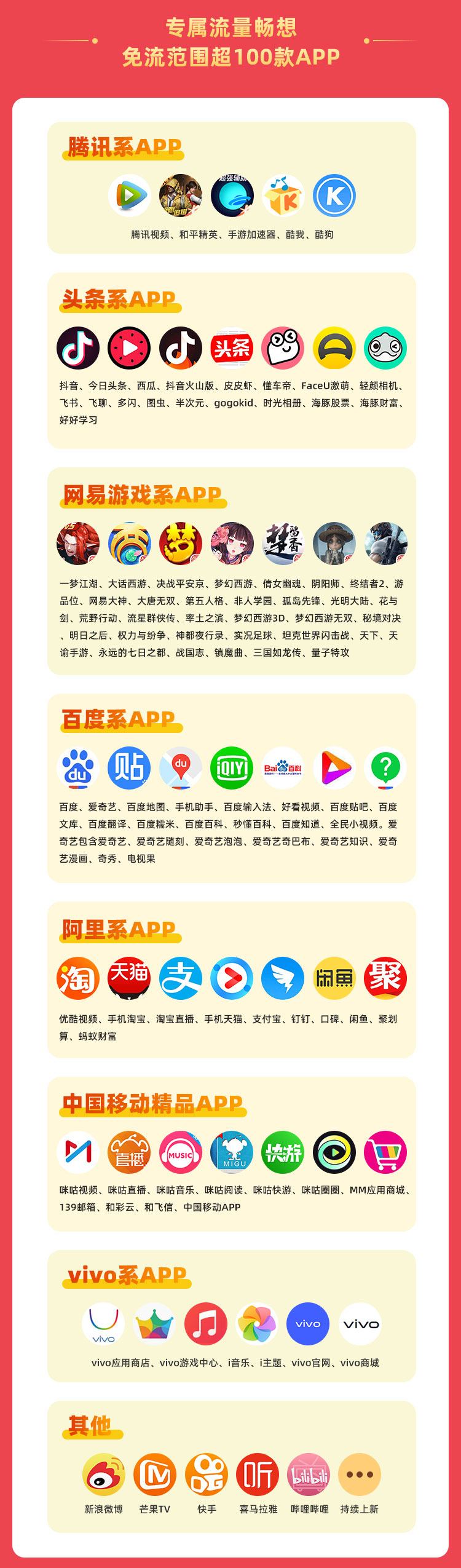 2)自选 3 款热门 APP 免流可选范包括:抖音短视频、腾讯视频、爱奇艺、优酷、快手、哔哩哔哩、芒果 TV、百度、手机海宝、喜马拉雅、网易云音乐、梦幻西游。如有变更以领取页面为准。
